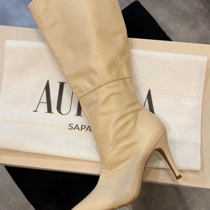 O cano alto tem estrutura macia e caimento fluido, ajustando-se suavemente à perna sem marcar.