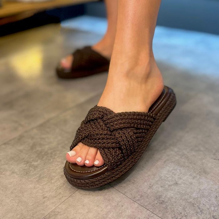 Seu design é marcado pelo cabedal elaborado em tramas espessas de corda, trabalhadas em um belíssimo trançado frontal, que cria volume e textura, garantindo um visual leve e ao mesmo tempo sofisticado.