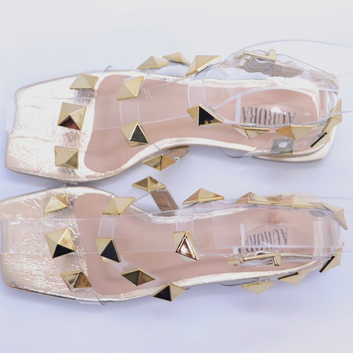 Cada tira é adornada com aplicações em formato de pirâmide, conferindo um toque ousado e contemporâneo ao design.