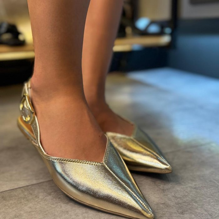 O design slingback, com fivela lateral dourada ajustável, valoriza o tornozelo e oferece um calce firme e estiloso.