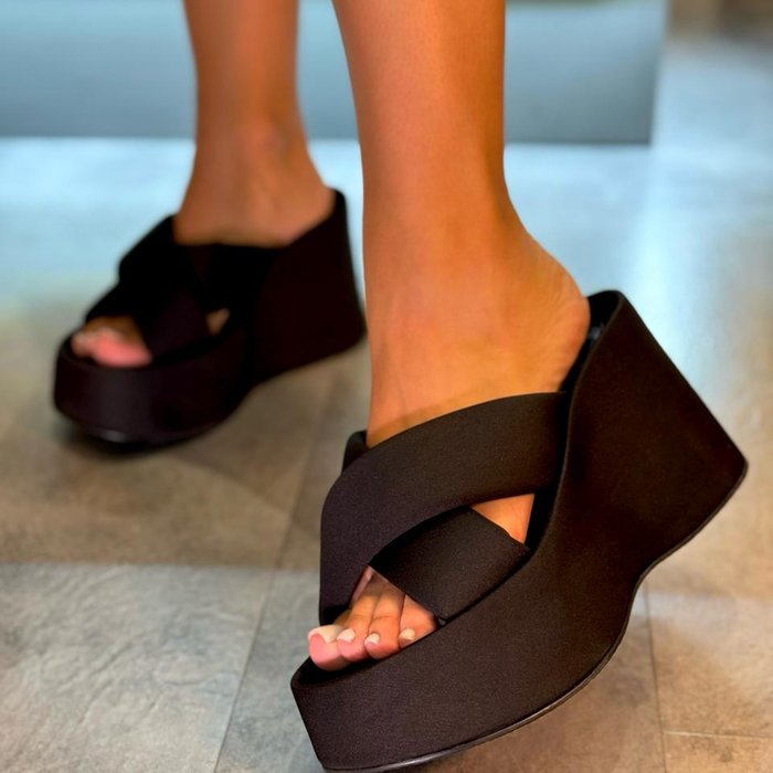 As tiras largas se cruzam na região frontal, criando um visual clean, minimalista e atual — ideal para quem busca um modelo versátil, porém marcante.