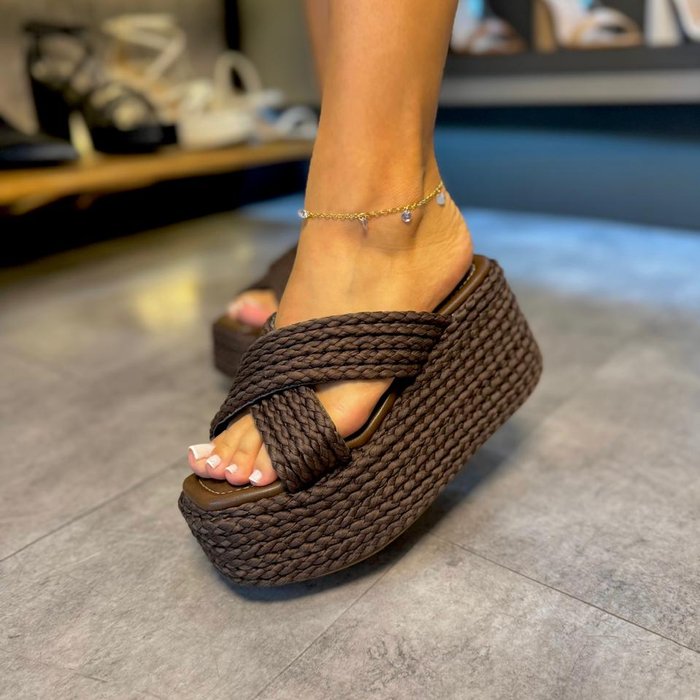 As tiras largas em corda, cruzadas sobre o pé, garantem um ajuste confortável e seguro, além de criarem um efeito volumoso e moderno. A construção em trama reforça a estética rústico-chique, enquanto a plataforma elevada proporciona altura com estabilidade e conforto ao caminhar.